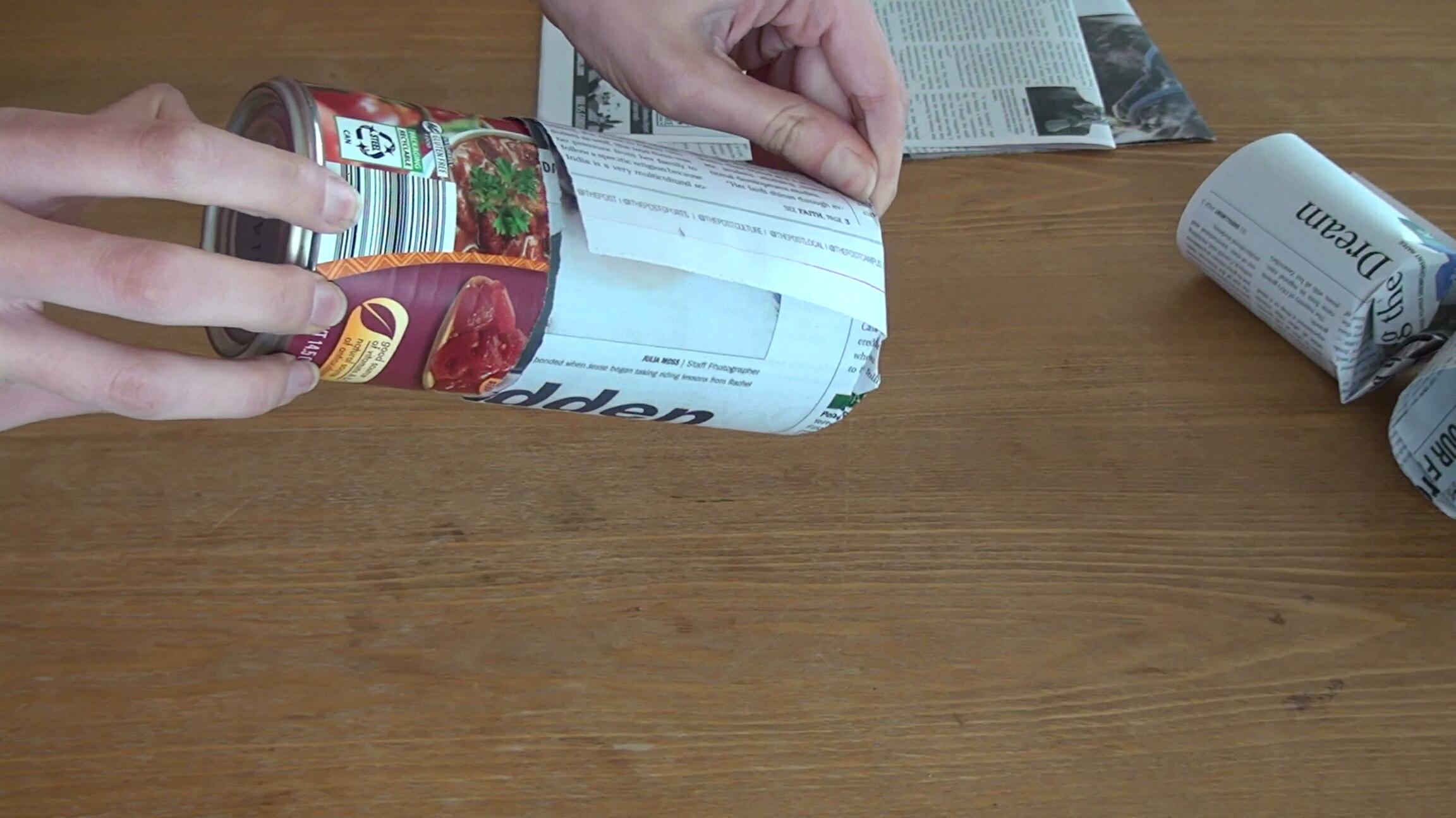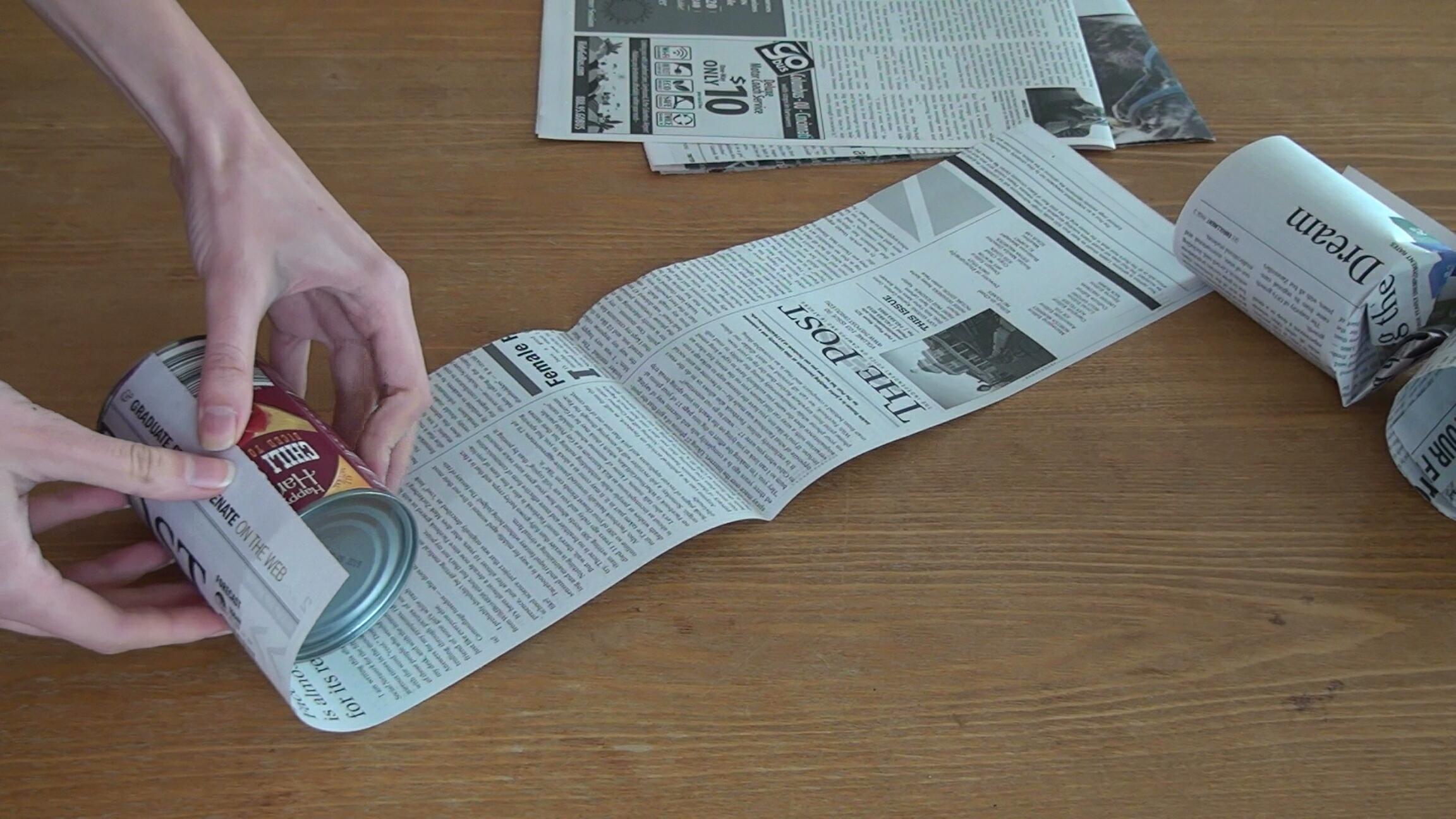 Cut the newspaper into strips about as tall as the can, with a couple of extra inches at one end for the bottom. Start rolling one page of the newspaper.